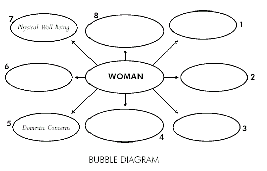 Scan the Contents page. Without using the terminology of the magazine, complete the following bubble diagram, depicting aspects of a woman's life that are highlighted by the magazine.