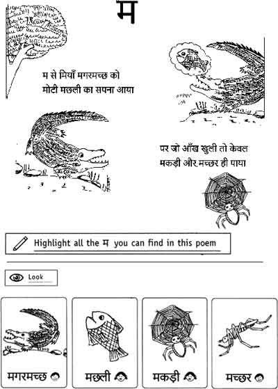 Compare the situation of these two kinds of Hindi learners: a 5-6 year old child growing up in a Hindi-speaking milieu and her counterpart, growing up in an English or Telugu speaking milieu. They have entirely different starting points. The six-year-old child (a typical first-grader) who is a native speaker of Hindi has, at the very least, 4 years of active experience and practice with the language (if we take as an average that children start speaking around 2). She has usually mastered the phonetics, has a command over a fairly vast vocabulary and can orally generate quite a sophisticated syntax with ease and accuracy. What she has to begin to learn is the written code of the Devanagari script, so that she is able to read and write, while enlarging her vocabulary and idiom in the language. On the other hand, the child who speaks Telugu or Tamil has to not only grapple with the relatively abstract written code of Hindi (just like her classmate whose mother tongue is Hindi), but she is also expected to learn a new set of phonetics, morphology, syntax and socio-linguistics. The materials available, it became clear to me, assume this knowledge and hence fail to address most of these levels.