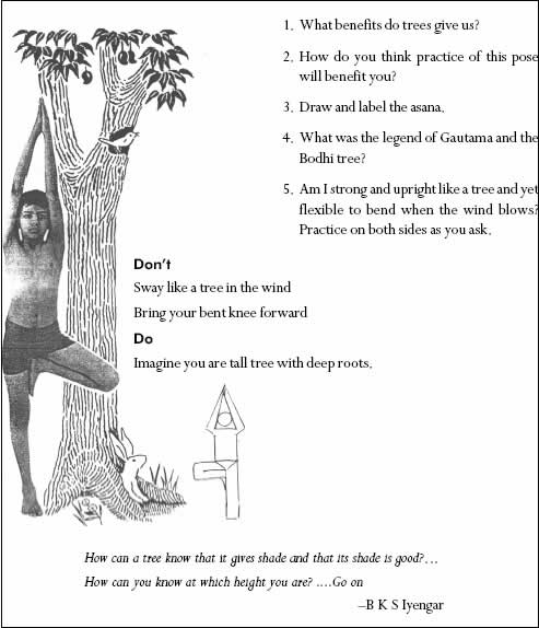 Worksheet questions covered a range of subjects in a non-linear fashion. Some questions related to awareness of the body in the pose (what do you have to do in order to bring your weight to the center? what happens to your trunk as you ‘sit’? which parts of the body do you think this asana strengthens?). Others had more to do with intention or visualization (do you feel like a warrior in this pose? Are you strong and upright like a tree and yet flexible to bend when the wind blows?). Some questions asked the pupil to recount related stories (Gautama and the Bodhi tree, Ravana and Hanuman), to draw and label the asana, or to illustrate the story. Some worksheets asked the children to make a list of wordsdescribing how they felt after the pose.